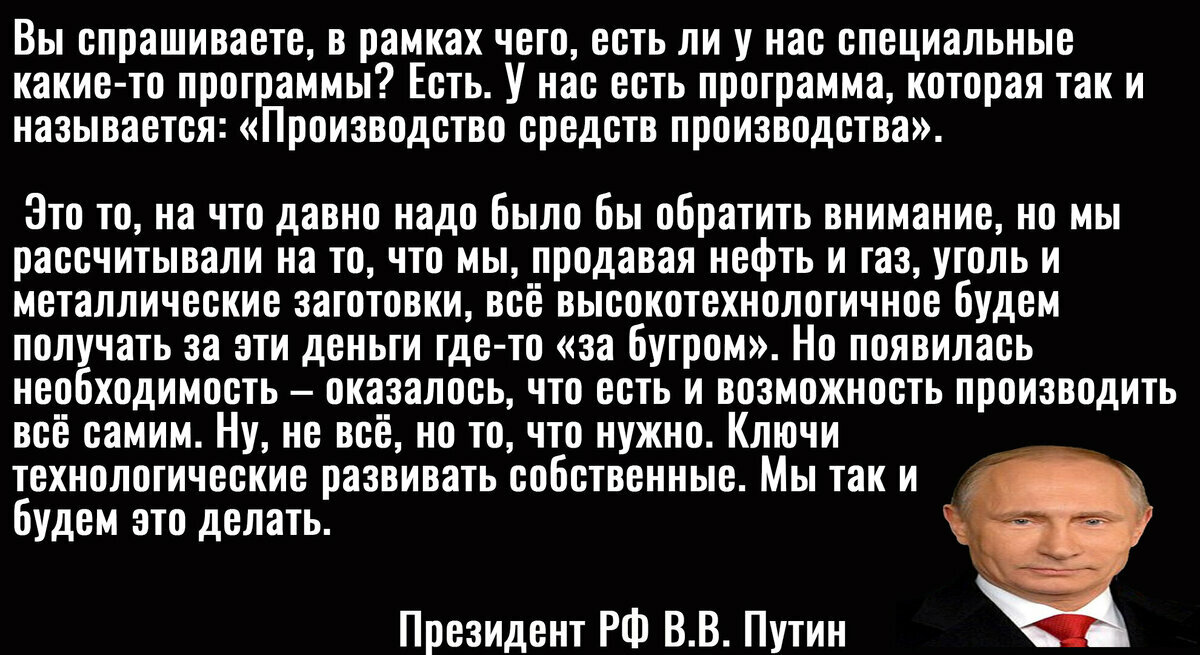 Другими словами, Путин предельно честно признался, что он и его команда являются прямыми продолжателями ельцинизма и курса Гайдара, который публично заявлял о том, что собственное станкостроение России не нужно, так как всё всегда можно купить в Европе, США или где-то ещё.