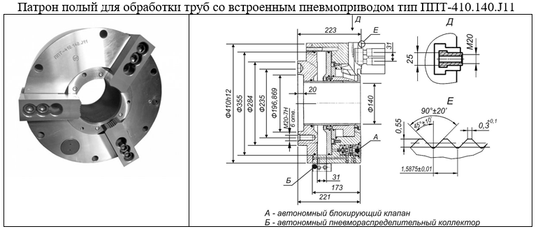 Патрон полый для обработки труб со встроенным пневмоприводом модели ППТ-410.140.J11 служит для комплектации специальных токарных станков, предназначенных для обработки труб в нефте- и газодобывающей промышленности. Для обеспечения подачи сжатого воздуха в патрон во время зажима и разжима станок должен иметь фиксированный останов шпинделя.