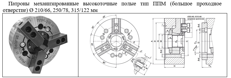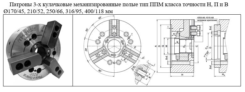 Патроны типа ППМ предназначены для закрепления штучных заготовок, обрабатываемых на станках токарной группы класса точности «В» в условиях серийного и массового производства. Патроны взаимозаменяемы с патронами ведущих европейских производителей (SMW-Autoblok, Schunk и др.) и азиатских производителей (KITAGAWA, AUTOStrong, Samchully и др.).