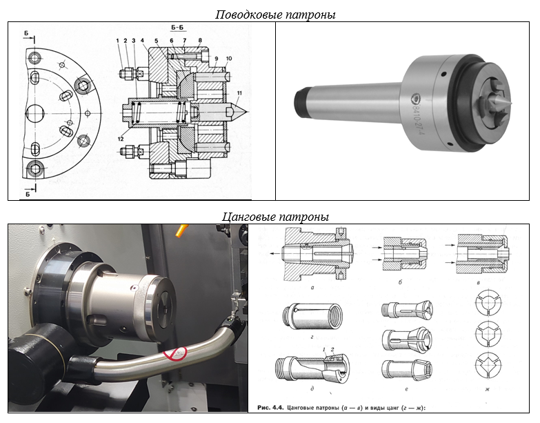При токарной обработке в настоящее время, кроме кулачковых типов патронов, пусть в меньшей степени, но используются зажимные патроны других типов: поводковые - различных конструкций, цанговые, мембранные.