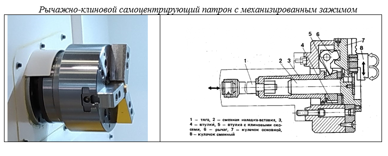 Данная конструкция патрона в механизме центрирования имеет большое количество сопрягаемых деталей, что не позволяет обеспечивать высокую точность центрирования зажимаемых заготовок. Поэтому рычажно-клиновые патроны используются преимущественно на черновых и получистовых операциях.