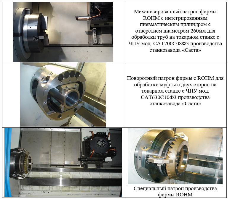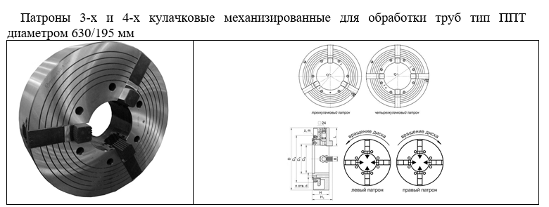 Патроны токарные 3-х и 4-х кулачковые механизированные комбинированные ППТ ЗН-630.205, ППТ 4Н-630.205 (аналог патронов РТ 783) предназначены для закрепления труб, цилиндрических и эксцентрических деталей, неконцентрического зажима заготовок сложной формы на токарных трубообрабатывающих станках. На шпиндельную бабку устанавливаются левый и правый патроны. Патроны работают от механизированного привода, входящего в конструкцию станка, передающего крутящий момент на зубчатое колесо, расположенное на заднем торце патрона. Патроны имеют винты для настройки на обработку заготовок различной формы сечения.