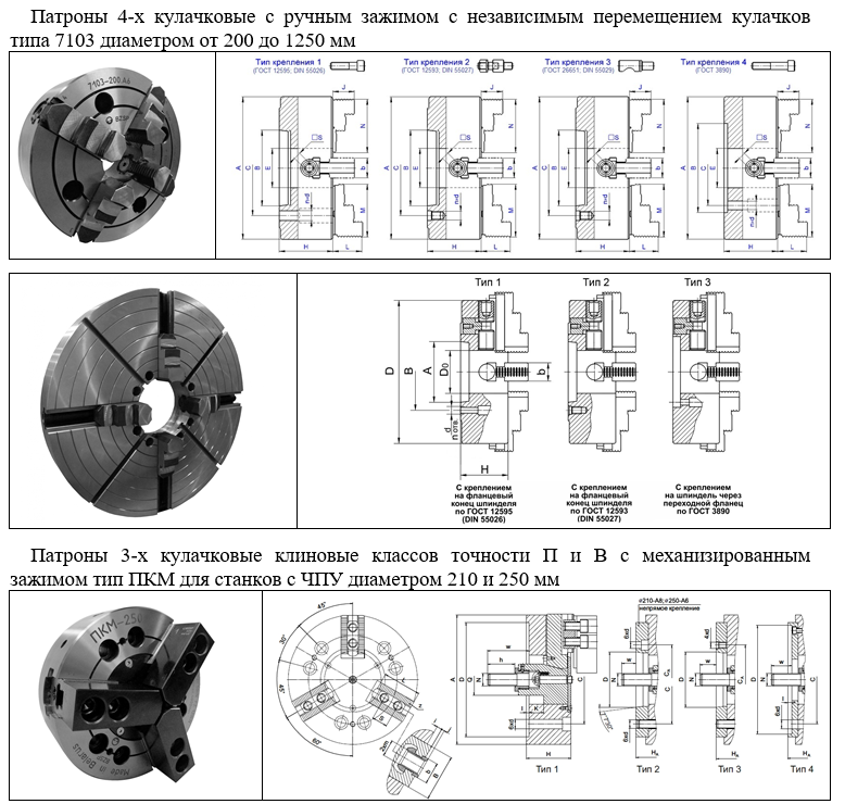 Кулачковые патроны в свою очередь делятся на: самоцентрирующие и с независимым перемещением кулачков, позволяющими осуществлять точную настройку крепления асимметричных заготовок. Самоцентрирующие патроны могут быть с ручным и с механизированным зажимом заготовок.