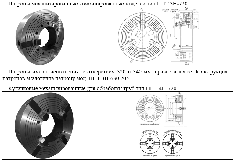 Патроны токарные 4-х кулачковые механизированные комбинированные ППТ 4Н-720.320, ППТ 4Н-720.340 (аналоги патронов 1Н983,1Н984, СА 983, СА 984, Bison-Bial мод. 2615-720-320, 2615-720-340), предназначены для закрепления труб, цилиндрических и эксцентрических деталей, неконцентрического зажима заготовок сложной формы на токарных трубообрабатывающих станках. Патроны работают от механизированного привода, установленного на станке, передающего крутящий момент на зубчатое колесо, расположенное на заднем торце патрона. На шпиндельную бабку станка устанавливаются левый и правый патроны. Патроны имеют винты для настройки на обработку заготовок различной формы сечения.
