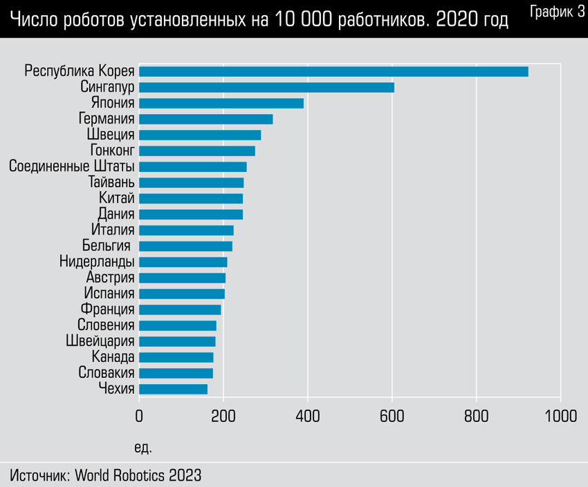 — Уровень роботизации принято измерять соотношением числа установленных в промышленности роботов к 10 тысячам человек, занятых в промышленности. Лидером по этому показателю в мире является Южная Корея — 1012 роботов на 10 тысяч человек в 2022 году.