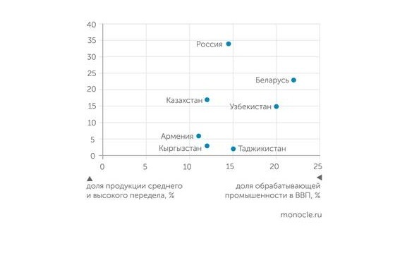 Для понимания позиций: доля всей обрабатывающей промышленности в ВВП России сегодня около 14%. Этот показатель ниже, чем в Таджикистане (16,2%). А такие «промышленно развитые» страны, как Узбекистан (20%) и Белоруссия (28%) заметно опережают Россию по доле обработки в экономике.