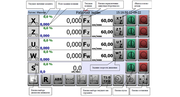 - Индикация положения осей, скорости шпинделя и момент на них;