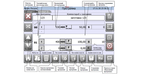 - Автоматический режим выполнения программы перемещений. Координаты и скорости перемещений могут быть заданы в табличном виде как на экране системы, так и в Excel или Блокноте на ПК, а также получены в режиме «Обучения» при ручных перемещениях. Программа может быть дополнена комментариями на русском языке. Количество созданных программ ограничено только памятью системы (3 Гб);