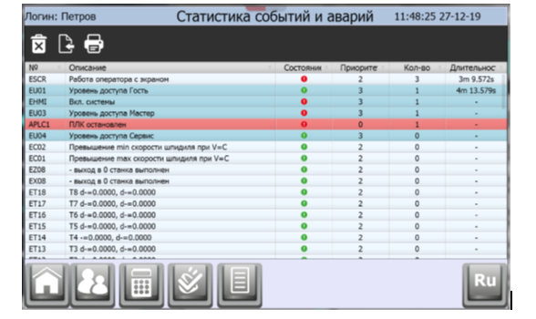 - Регистрация в журнале событий и аварий времени включения и выключения станка, действий оператора, режимов работы станка и его элементов. Возможна выгрузка данных на ПК через USB или ftp сервер.