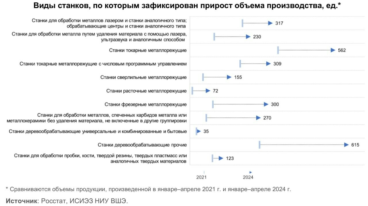 📉 Мы уже довольно давно не делали наш традиционный обзор отечественного станкостроения, но зато его сделали в ИСИЭЗ НИУ ВШЭ. Согласно ему, за первые четыре месяца 2024 года было произведено 18,6 тыс. станков, и это на 21,5% больше, чем за такой же период 2023 года.