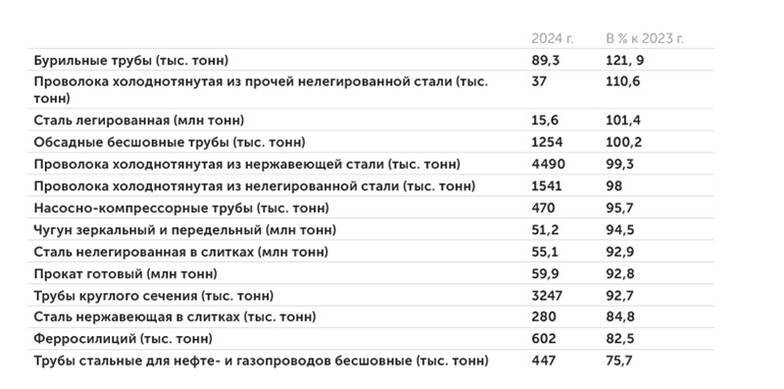 Экспортируются преимущественно металлургические заготовки. По данным ФГУП «ЦНИИчермет», в 2024 году экспорт металлопродукции рухнул на 37% к уровню 2021 года и на 17% к уровню 2023-го — до 18,7 млн тонн. Продажи на внешний рынок сортового проката снизились до 3,2 млн тонн (−9% к 2023 году и −27% к 2021-му). Экспорт плоского проката подрос относительно 2023 года до 3,73 млн тонн, но к уровню 2021 года это −56%. Экспорт труб стальных сократился до 0,7 млн т (−33% к 2023 году и −52% к 2021-му).