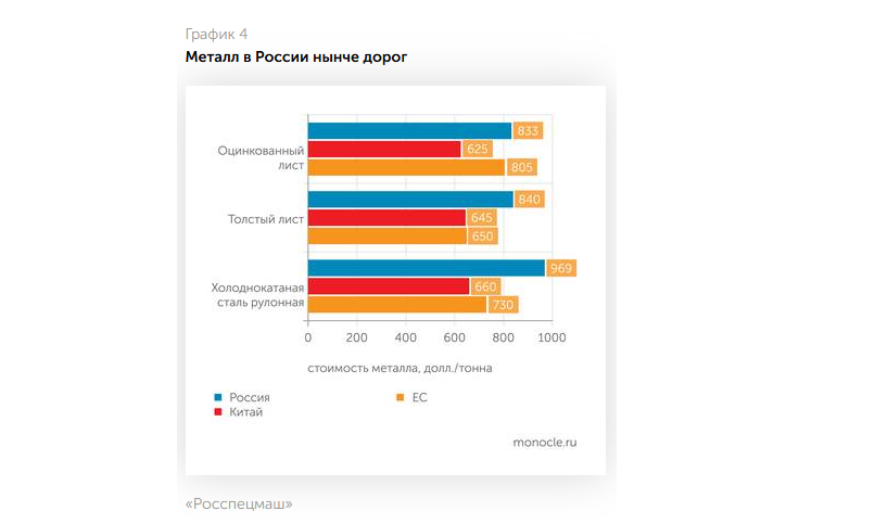 «Одной из проблем для отечественных производителей специализированной техники являются высокие цены на российский металл на внутреннем рынке», — заявил «Моноклю» представитель ассоциации производителей спецтехники «Росспецмаш». Президент ассоциации Константин Бабкин на том же совещании в Совфеде попросил не вводить пошлины на метизы, поскольку это повлечет за собой еще большее увеличение их стоимости на внутреннем рынке.