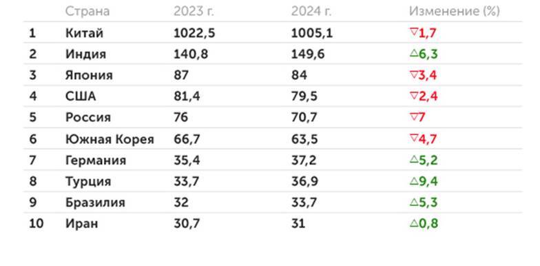 Мировое производство стали в 2024 году, по данным World Steel Association (WSA) снизилось на 0,9%, до 1,88 млрд тонн. За исключением Индии пятерка крупнейших мировых игроков сократила производство: Китай — на 1,7%, до 1 млрд тонн, Япония — на 3,4%, до 84 млн тонн, США — на 2,4% до 79,5 млн тонн, Россия — на 7%, до 70,7 млн тонн. Индия — единственная страна из пятерки, нарастившая производство: на 6,3%, до 149,6 млн тонн.