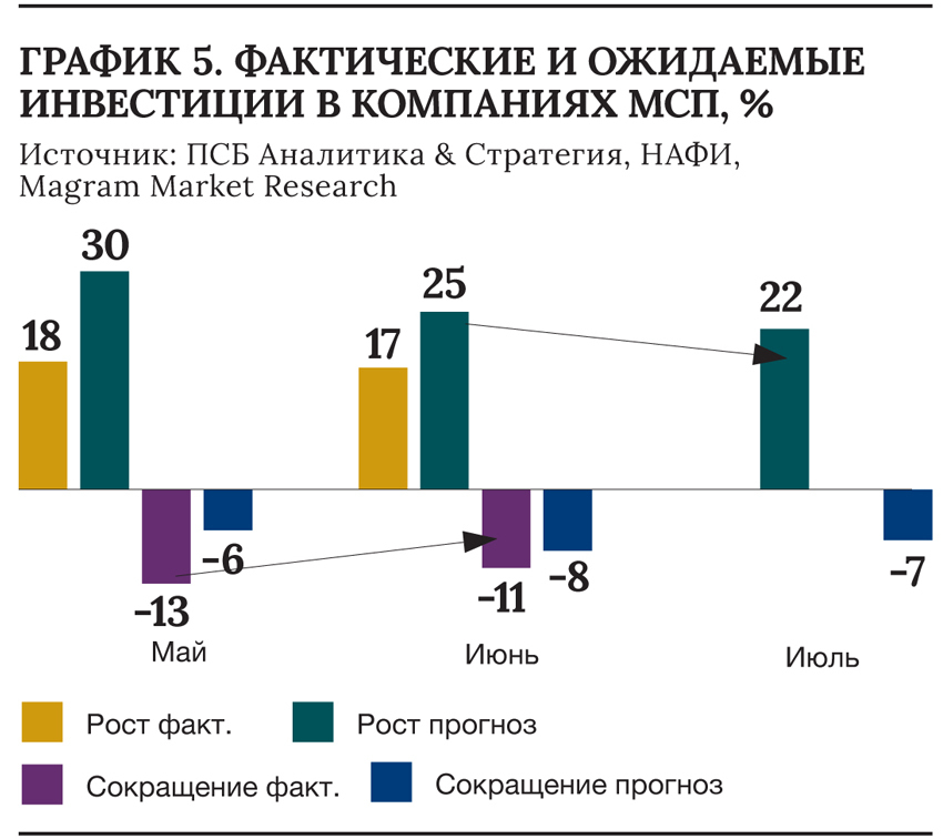 Доля компаний, сокративших инвестиции, снизилась на 2 п.п., до 11%. Вместе с тем наращивали инвестиции 17% компаний (-1 п.п.). Основная инвестиционная активность в сегменте МСП последние несколько месяцев сосредоточена в среднем бизнесе: так, в июне около трети таких компаний сообщили, что наращивали вложения, и столько же планируют это делать в будущем.
