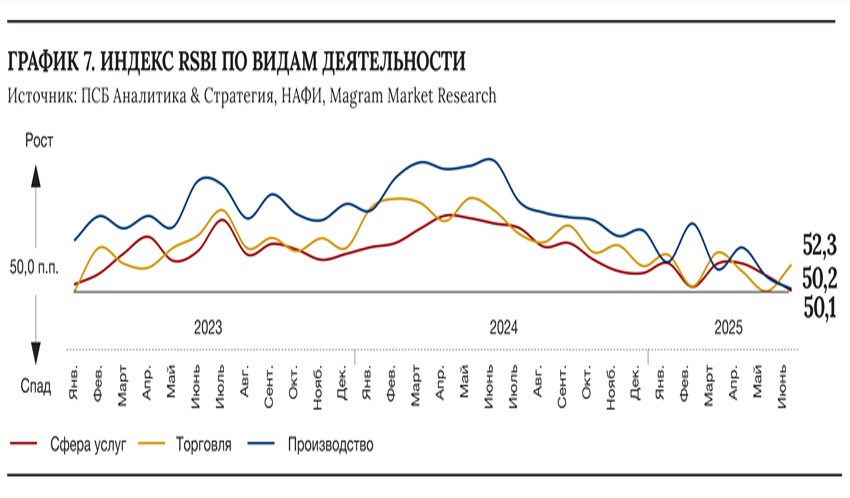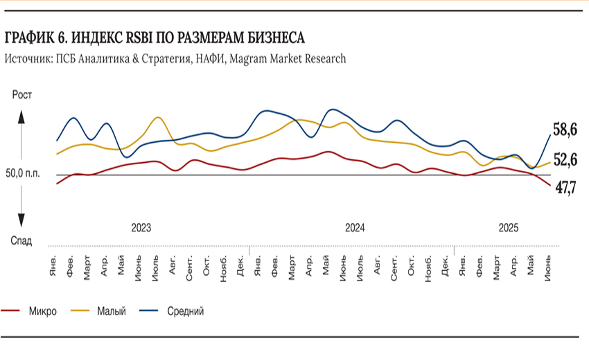 В июне 2025 года индекс RSBI незначительно вырос (+0,1 п.п.) и составил 51 пункт — деловая активность МСП осталась в зоне слабого роста.