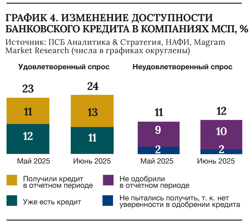 При этом растет доля компаний, которым кредит одобрен не был, — в июне это 10% (+1 п.п.). В частности, чаще отказ получали предприниматели из сферы услуг (12%).