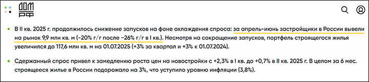 Итак, идём по причинно-следственной связи дальше. Снижение выдачи ипотеки влечёт за собой замедление вывода новых квадратных метров на рынок. Оно в 2025 году рекордно упало: во втором квартале, по данным ДОМ.РФ, сразу на 20%. То есть стройки замораживаются.