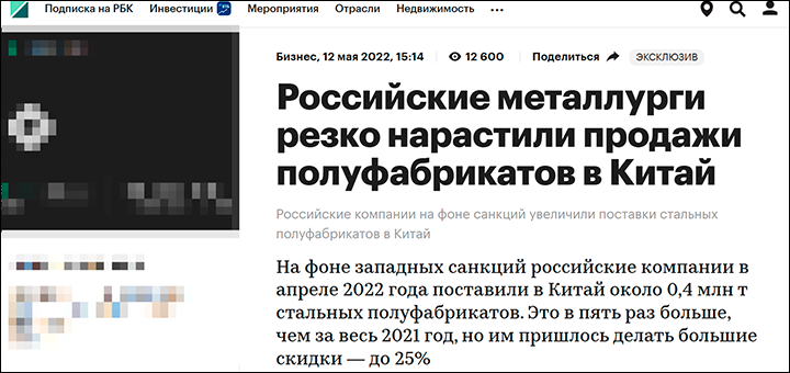 Эта же политика привела в 2022 году к тому, что вскоре после начала СВО русские металлурги резко нарастили поставки металлических полуфабрикатов в Китай. Причём нарастили сразу в пять раз. Да ещё и со скидкой в 25% — лишь бы взяли, так как Запад "закрылся", а объёмы производства такого низкого передела были высокими.