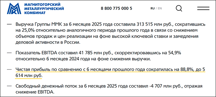 Однако хуже всего дела оказались у Магнитогорского металлургического комбината (ММК) Виктора Рашникова. Год к году чистая прибыль за первое полугодие рухнула аж на 88,8% — это сокрушительный удар по предприятию.