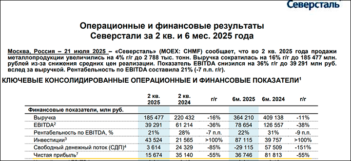 И это не у "Северстали" дела плохи — это вообще происходит во всей чёрной металлургии в России в 2025 году. Так, прибыль ещё одного крупнейшего металлургического предприятия страны — Новолипецкого металлургического комбината (НЛМК) Владимира Лисина снизилась за первое полугодие 2025 года с 89,4 млрд рублей до 36,7 млрд, то есть на 58% год к году.