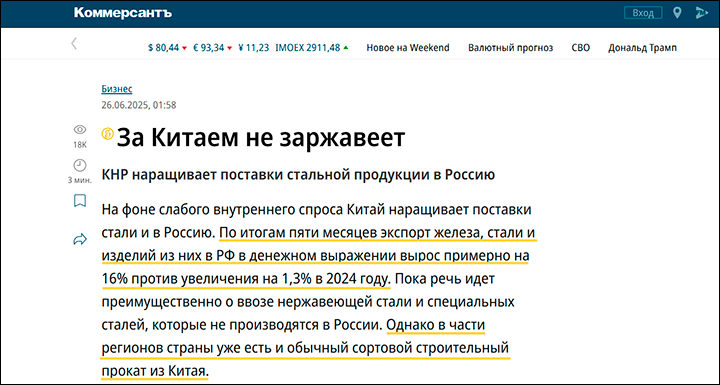 На этом фоне Китай, на самом деле, всё время наращивает поставки в Россию высококачественной стали. В 2025 году на фоне падения нашей металлургии на фронте поставок из КНР произошёл настоящий бум — поставки нержавеющей стали и специальных сталей, которые не производятся в России, выросли с 1,3% в 2024 году до 16% в этом.