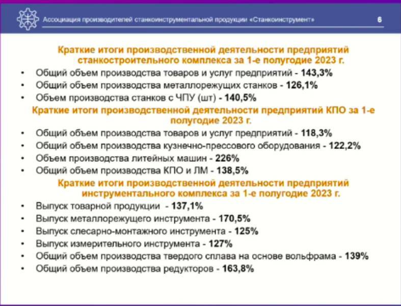 Для поддержки отрасли Минпромторг РФ намерен запустить новый нацпроект в рамках новой редакции федерального законопроекта по станкостроению: в течение месяца ведомство через ВЭБ.РФ намерено начать выделение ресурсов по программе поддержки станкостроения при контрактации исполнения заказов, пополнения оборотного капитала и реализации инвестпроектов. Также ведомство намерено восстановить субсидирование оборотных кредитов, добавить средства на реализацию постановления правительства РФ №1206 («Субсидии производителям станкоинструментальной продукции в целях предоставления покупателям скидки при приобретении такой продукции». — Ред), идет формулирование новых тематик по постановлению правительства №1649 («Об утверждении правил предоставления субсидий из федерального бюджета на компенсацию части затрат на проведение НИОКР». — Ред.), которые будут финансироваться.