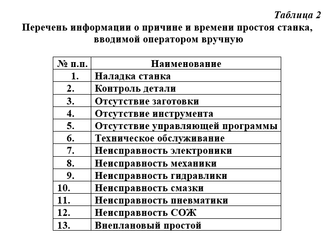 Перечень причин простоя станка представлен в таблице 2 и может быть расширен при необходимости.