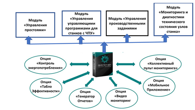 На нижерасположенном рисунке представлена функциональная блок-схема системы мониторинга эффективности работы и диагностики технического состояния узлов станков с ЧПУ АИС «Диспетчер» с основными модулями и опциями.