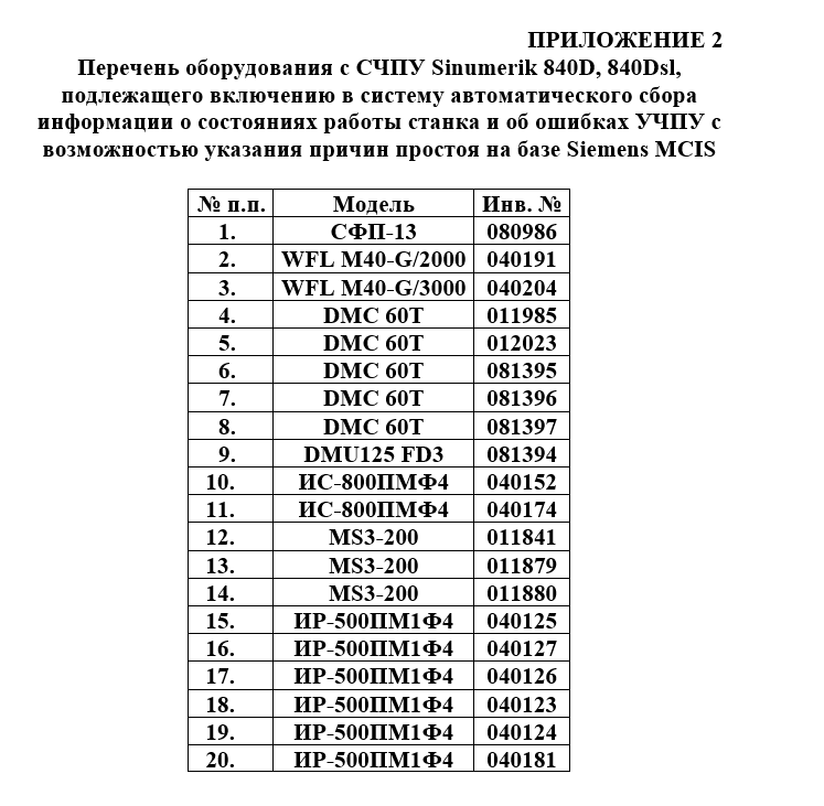 9.8. На втором этапе установить модуля автоматического сбора информации о состояниях работы станка и об ошибках УЧПУ с возможностью указания причин простоя на базе системы Siemens MCIS (Motion Control Information System) на оборудовании, оснащенном СЧПУ Siemens Sinumerik 840D, 840Dsl, перечень которого представлен в приложении 2.
