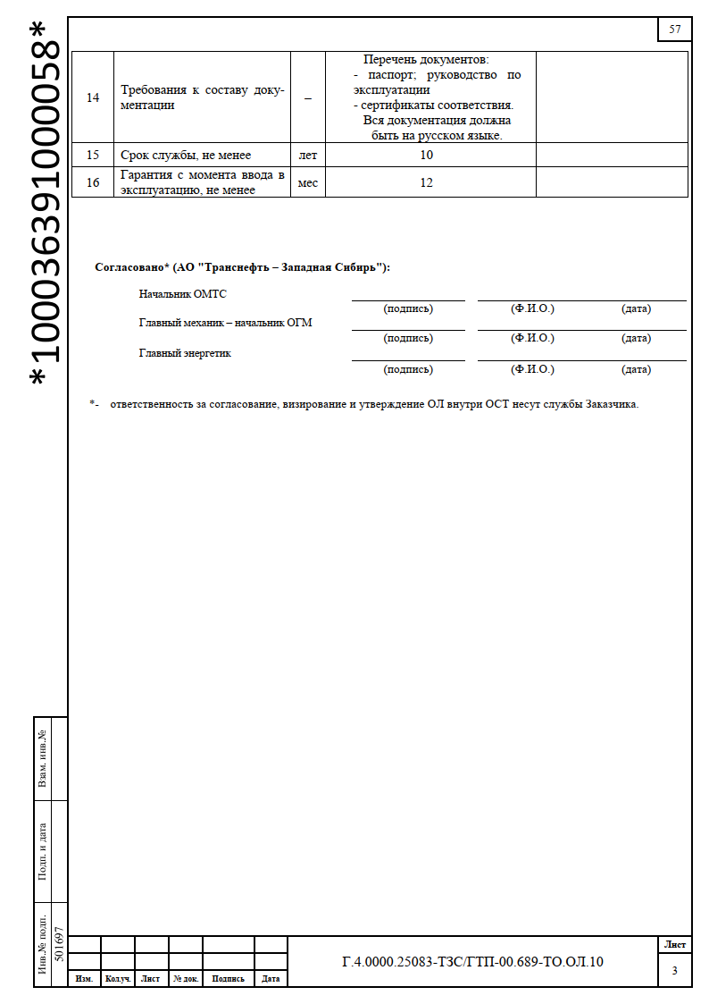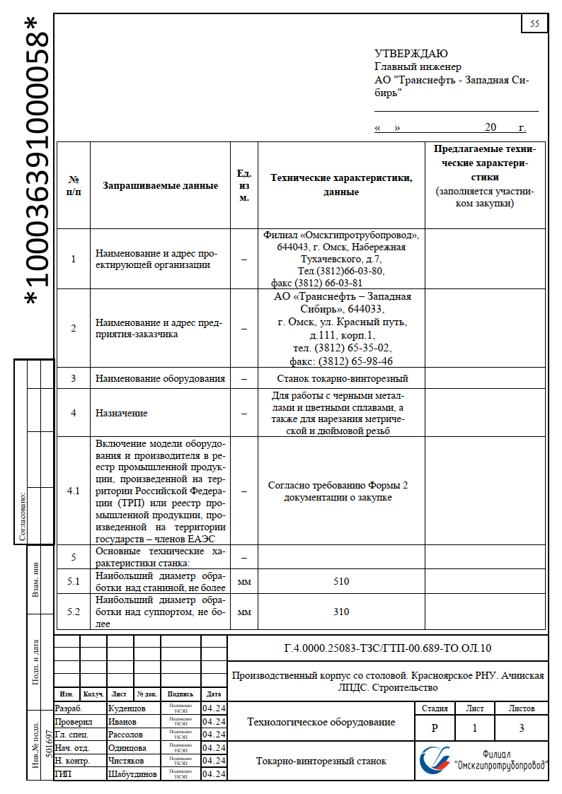 В соответствии с регламентом ПАО «Транснефть», ТКП должно содержать фразу «предлагаемый к поставке станок полностью соответствует параметрам и комплектации по опросному листу № Г.4.0000.25083-ТЗС/ГТП-00.689-ТО.ОЛ.10».