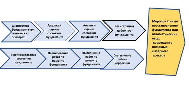 При наличии проблем, оценивают критичность и виды дефектов фундамента, далее определяют, что в фундаменте необходимо исправить и при необходимости составляют таблицу погрешностей и вводят в ручном или автоматическом режимах коррекцию по перемещению по координатам.