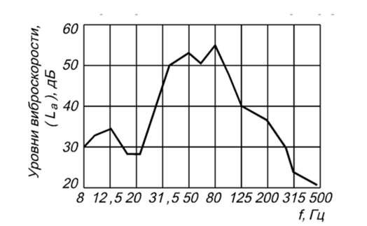 Основные составляющие в спектре лежат в диапазоне частот 31,5-125 Гц, максимум в спектре находится на частоте 80 Гц.