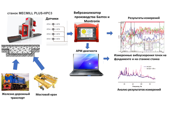 На нижерасположенном рисунке показана блок-схема измерения внешней вибрации, поступающей на фундамент станка от работы мостового крана в цеху и от проходящих на расстоянии 40 метров железнодорожных составов.