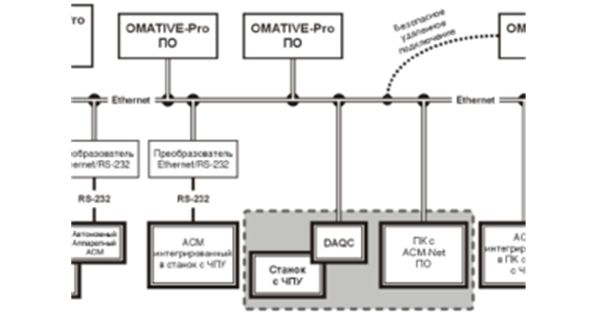 OMATIVE PRO-Сервер представляет из себя client-server-приложение на базе системы MES, которое обеспечивает работу системы мониторинга OMATIVE ACM и АCM станции. В современных УЧПУ, построенных на базе персональных компьютеров, ACM станция встроена в УЧПУ. И OMATIVE PRO-Сервер взаимодействует с ней через TCP/IP интерфейс. В более старых УЧПУ, «OMATIVE ACM» и «OMATIVE PRO Сервер» взаимодействуют через RS232 сериальный порт или через специальный RS232/Ethernet преобразователь.