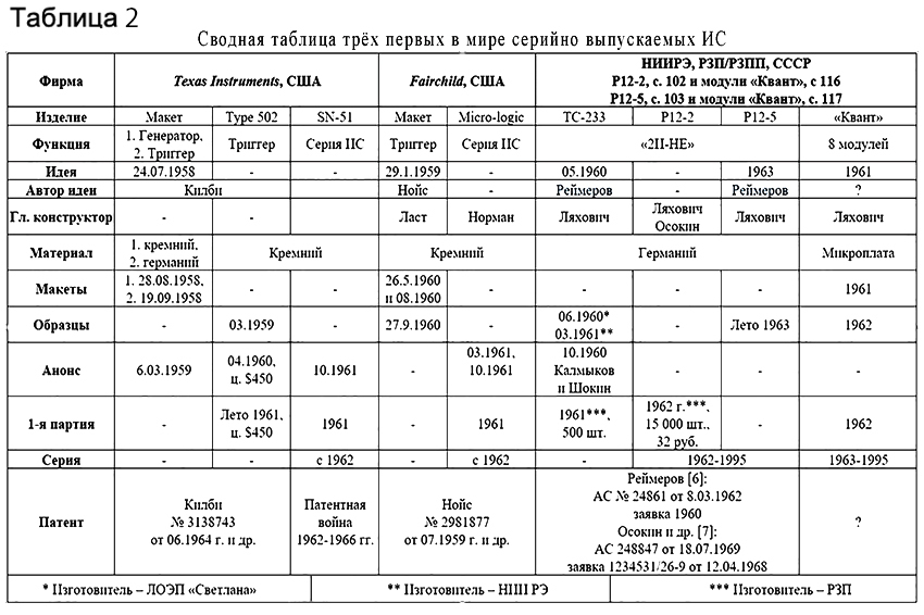Для объективной оценки приведем сводную таблицу трех первых в мире серийно выпускаемых ИС (см. таблицу 2).