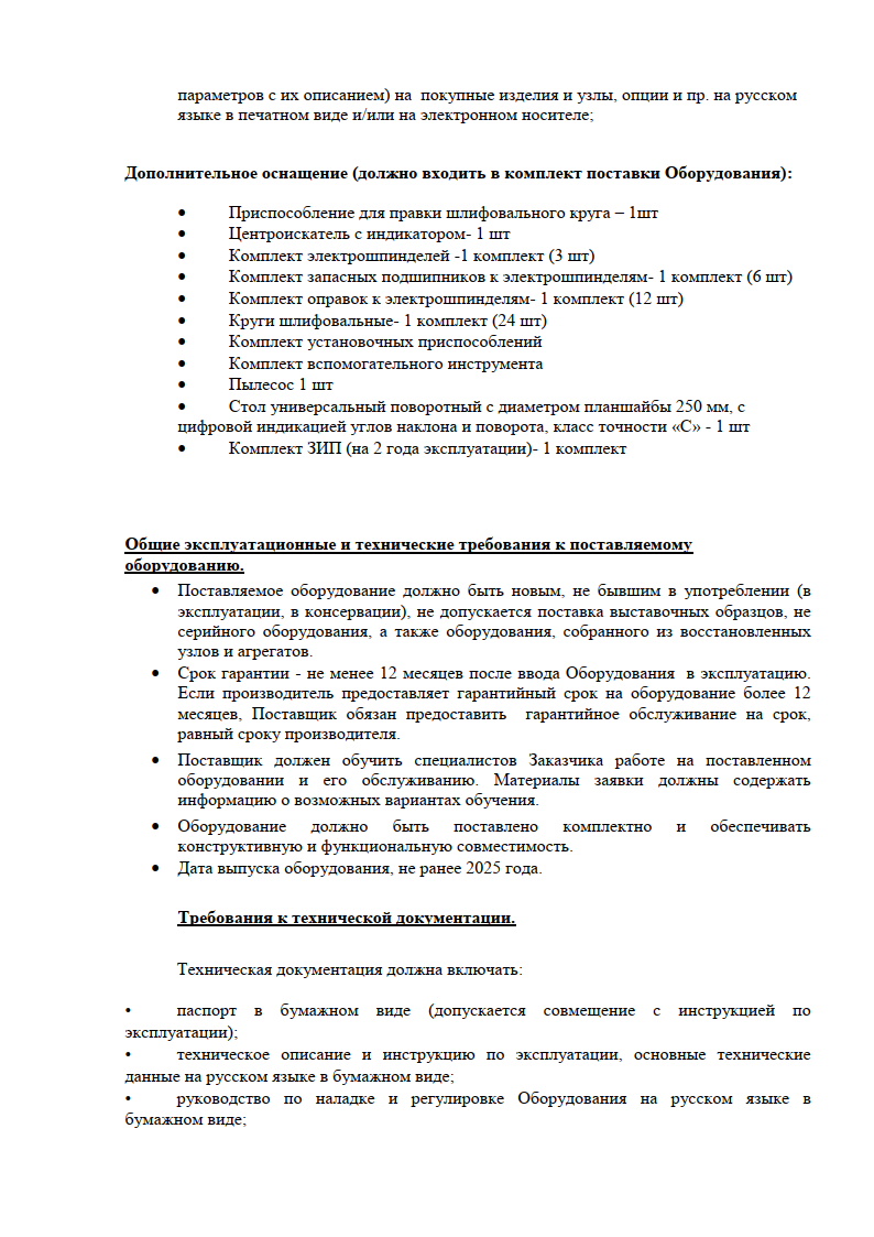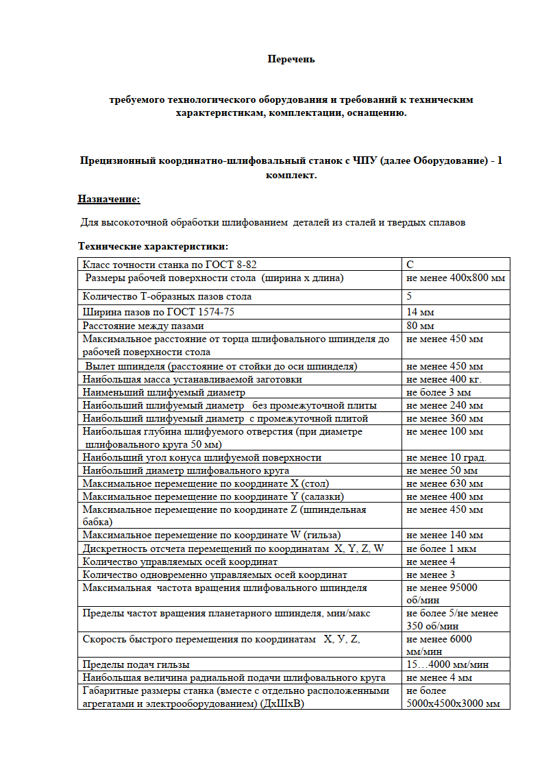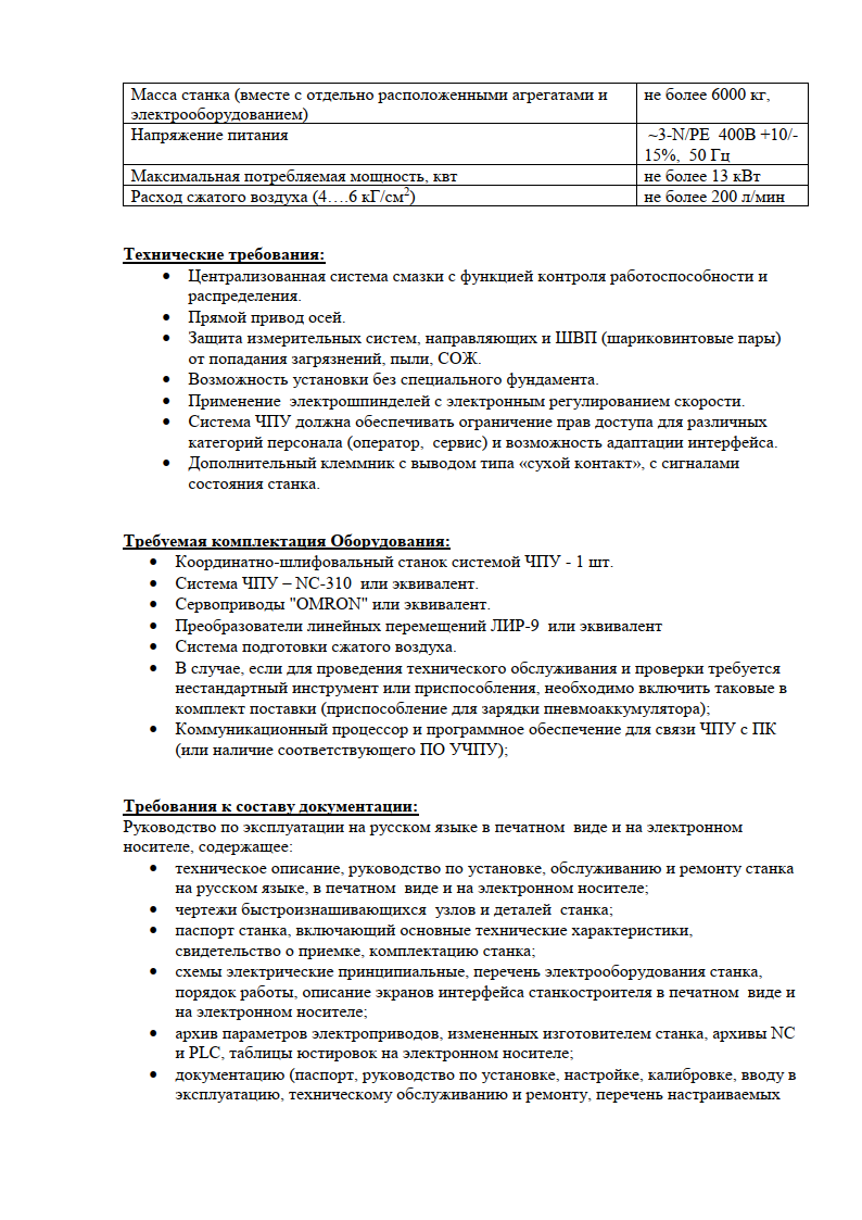 Ввиду заинтересованности нашего предприятия в приобретении координатно-шлифовального станка с ЧПУ в количестве 1 шт. просим Вас рассмотреть проект нашего технического задания, рассмотреть комплектность поставки, предложить дополнительное оснащение (доп.осей и опционального дополнения), возможность поставки данного оборудования или предложить Ваше оборудование с характеристиками, не ухудшающими наши потребности.